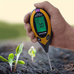 10. Портативный датчик азота в растительной массе, N-тестер N-Тестер – портативный прибор, использующий фотометрический метод диагностики растений, позволяющий перейти от мониторинга к цифровому планированию в питании растений, освещённости, применения средств защиты растений. Принцип работы N-Тестера устроен на вычислении величины поглощенного красного спектра и отражённого ближнего красного. Величина меняется от количества поглощённого света хлорофиллом листа. Через количество хлорофилла определяем потребность растений в минеральном питании, прежде всего в азоте. 11. Анализатор почвы «Мегеон» Портативный измерительный прибор дает возможность осуществлять непрерывный контроль за состоянием почвы. Полученные результаты измерений выводятся на ЖК-дисплей прибора. Достаточно погрузить измерительный зонд в исследуемый грунт вблизи растения. Кроме уровня кислотности почвы, данный прибор измеряет температуру и влажность почвы, а встроенный датчик освещенности постоянно информирует пользователя об уровне интенсивности солнечного света. Большой ЖК-дисплей со встроенной подсветкой позволяет пользоваться прибором даже в условиях плохой освещенности. Особенности: