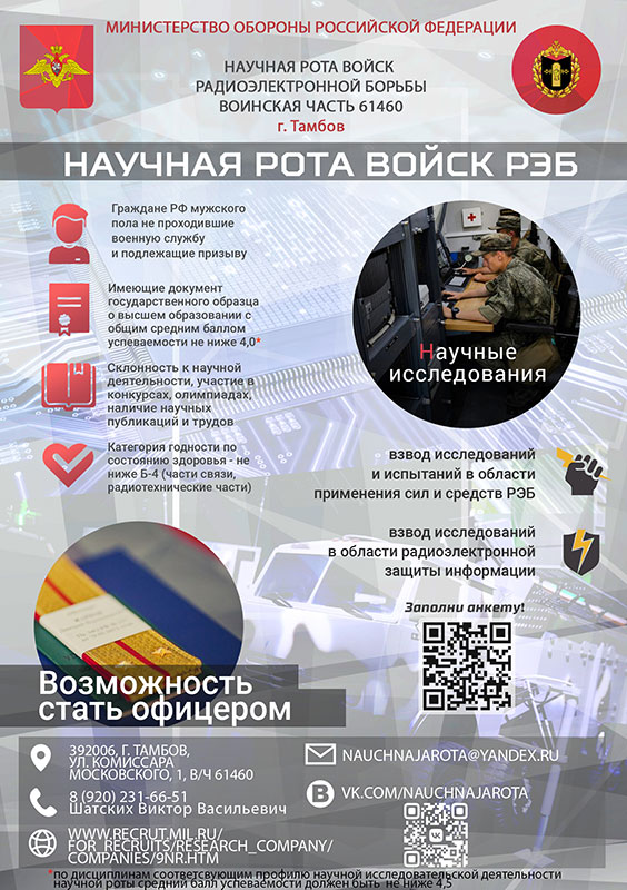 Научная рота войск радиоэлектронной борьбы ВС РФ (г. Тамбов) проводит набор выпускников Оренбургского университета в целях обеспечения своевременного и качественного комплектования профильными специалистами, желающих проходить военную службу по призыву.