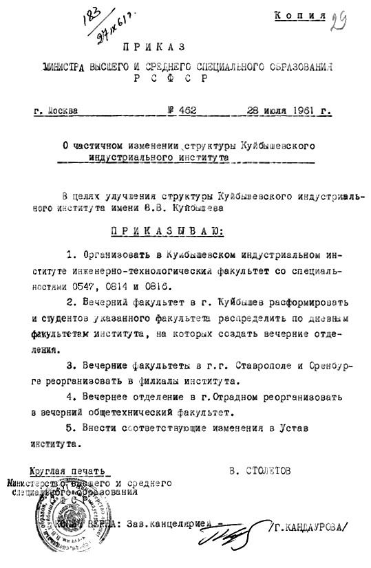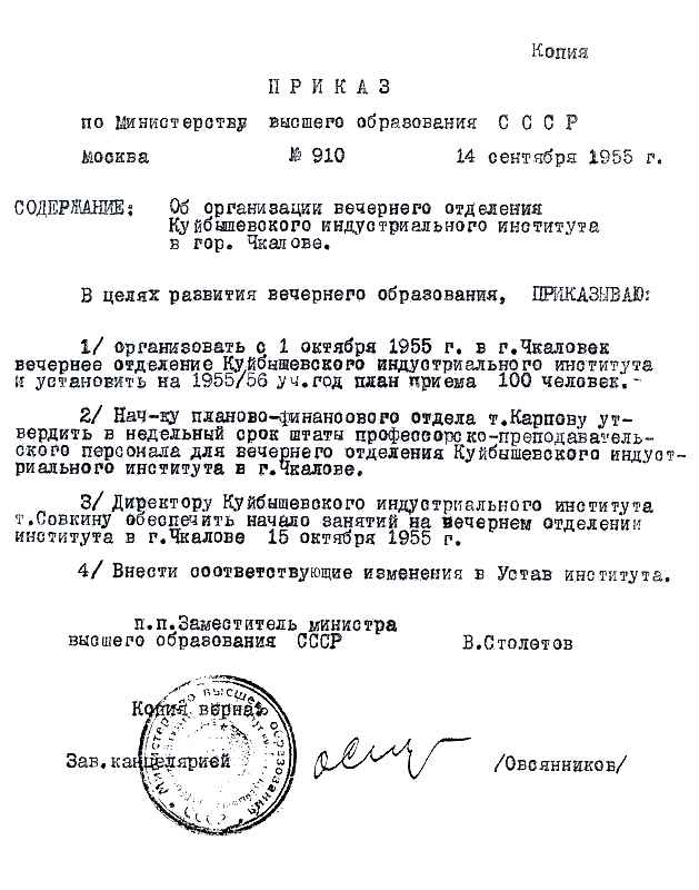14 сентября 1955 года последовал приказ № 910 Министерства высшего образования СССР об открытии с 1 октября 1955 года в городе Чкалове вечернего отделения Куйбышевского индустриального института имени В. В. Куйбышева.