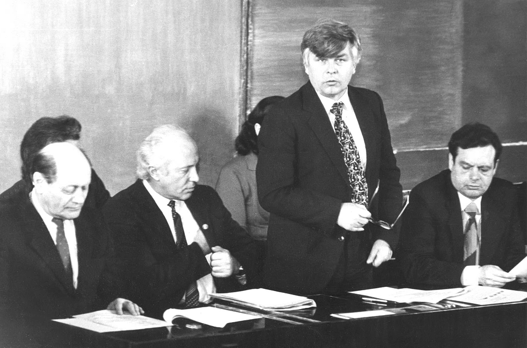 14 апреля 1985 г. – научно-техническая конференция. Профессор А.И. Тихонов, проректор по уч. работе Ю.Ф. Верещагин, проректор по науч. работе В.Б. Шашков, председатель парткома А.С. Толстов.