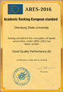 OSU has received a certificate of category B in rating or Russian universities ARES-2016 (Academic Ranking of World Universities — European Standard). This category implies reliable quality of teaching, scientific activity and employability of graduates. ››› 11.10.2016