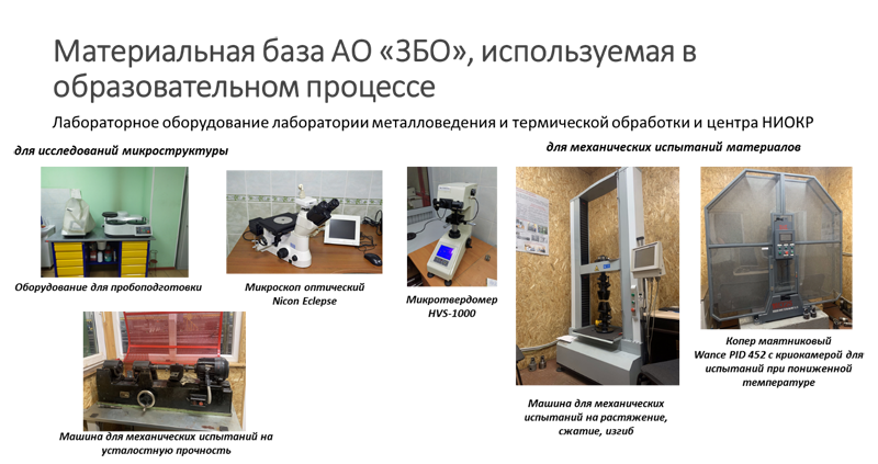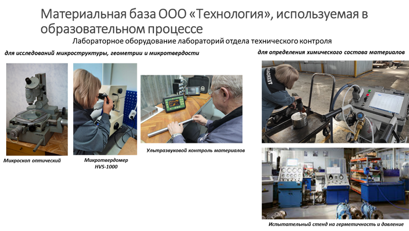 Материально-техническая базаЗа НОЦ закреплены помещения: 20-003 — лаборатория; 20-006 — кабинет; 20-007 — лаборатория. Лаборатории кафедры оснащены современным оборудованием для исследования материалов: