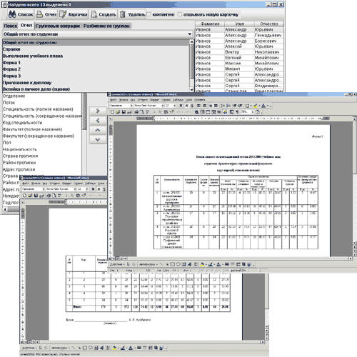 - формирование отчетов по итогам экзаменационной сессии по факультетам, специальностям, курсам, формам обучения: количество студентов; количество студентов, продливших сессию; количество обязанных сдавать сессию; сдавших сессию (количество, %); сдавших только на "отлично" (количество, %); сдавших на "отлично" и "хорошо" и только на "хорошо" (количество, %); сдавших на "удовлетворительно" (количество, %); получивших "неудовлетворительно" по одному и более предметам (количество, %) и т.п.