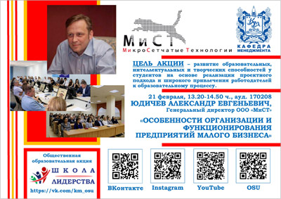 21 февраля кафедра менеджмента ОГУ приглашает принять участие в практико-ориентированном занятии в рамках общественной образовательной акции «Школа лидерства».