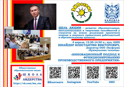 4 апреля кафедра менеджмента ОГУ приглашает принять участие в практико-ориентированном занятии в рамках общественной образовательной акции «Школа лидерства».