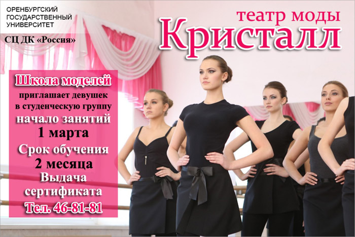 Школа моделей народного коллектива театра моды «Кристалл» Студенческого центра ОГУ — ДК «Россия» приглашает девушек в студенческую группу.