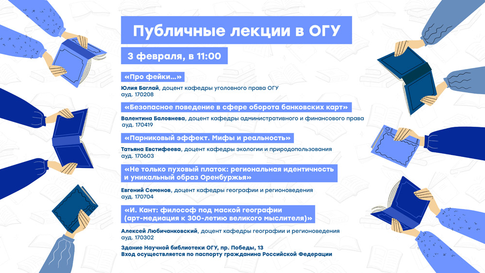 Уже в текущие выходные, в преддверии Дня российской науки, Оренбургский государственный университет откроет двери для слушателей публичных лекций. 3 февраля в 11:00 в научной библиотеке ОГУ ученые вуза представят научно-популярные материалы на пять интересных тем. Для участия приглашаются все желающие оренбуржцы.