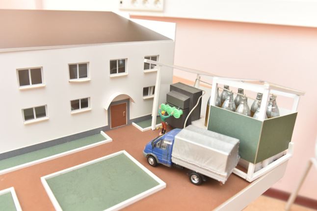 Макет технологической линии производства биотоплива из отходов животноводческого производства с участком, осуществляющим заправку автотранспортных средств.