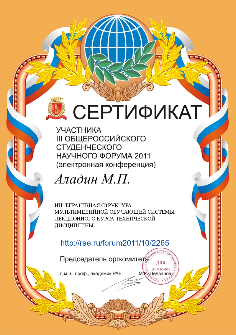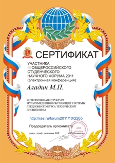 В феврале 2011 года Михаил Аладин принял участие в III Общероссийском студенческом научном форуме 2011. Его статья «Интегративная структура мультимедийной обучающей системы лекционного курса технической дисциплины», написанная под руководством Н.Г. Семеновой, размещена на сайте http://rae.ru/forum2011/10/2265.