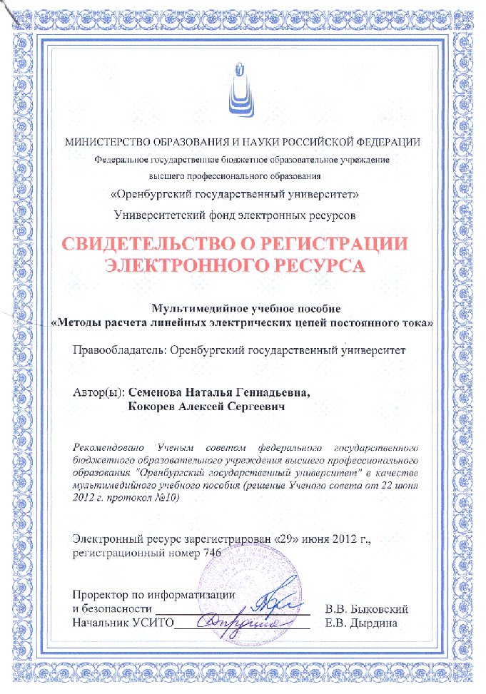 Получено свидетельство о регистрации мультимедийного учебного пособия в Университетском фонде электронных ресурсов «Методы расчета линейных электрических цепей постоянного тока». Авторы Н.Г. Семенова, А.С. Кокорев.