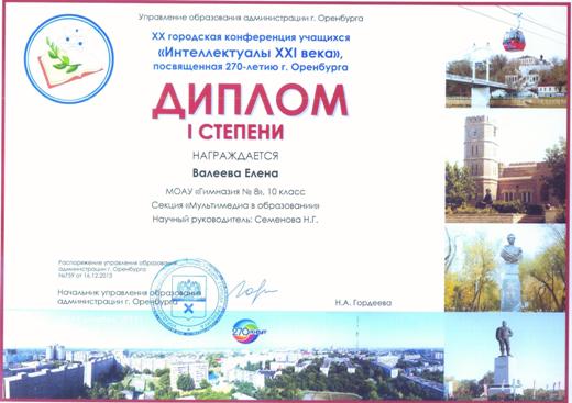 Электронный образовательный ресурс «Оренбург: прошлое, настоящее, будущее», разработанный Валеевой Е.Ф., ученицей 10 класса МОАУ «Гимназия № 8», под руководством Н.Г. Семеновой, отмечен дипломом 1 степени на городском конкурсе «Интеллектуалы XXI», секция «Информатика. Мультимедиа в образовании»» (декабрь 2013 г.).