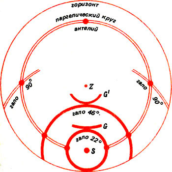 Если солнце или луна просвечивают через тонкие перисто-слоистые облака, состоящие из ледяных кристаллов, на небе часто появляются световые явления, называемые гало. В моменты, близкие к заходу или восходу солнца, как правило, когда оно находится на небольшой глубине под горизонтом, над солнцем, а иногда и под ним появляются световые столбы. На паргелическом круге против солнца или луны возникает светлое пятно — противосолнце (антелий) или противолуна (антиселена). Светлое пятно в солнечном вертикале, диаметрально противоположное солнцу, называют нижним солнцем. Нередко возникают касательные дуги к гало 22° и 46°, чаще горизонтальные и реже вертикальные. Бывают и другие косые дуги — около антелия, в окрестностях зенита. Некоторые формы гало имеют персональные названия по имени авторов, их обнаруживших и описавших, — гало Гевелия, гало Бугера, дуги Ловица, дуги Перри и др. Положение на небосводе большинства перечисленных форм гало показано на рисунке 1.
