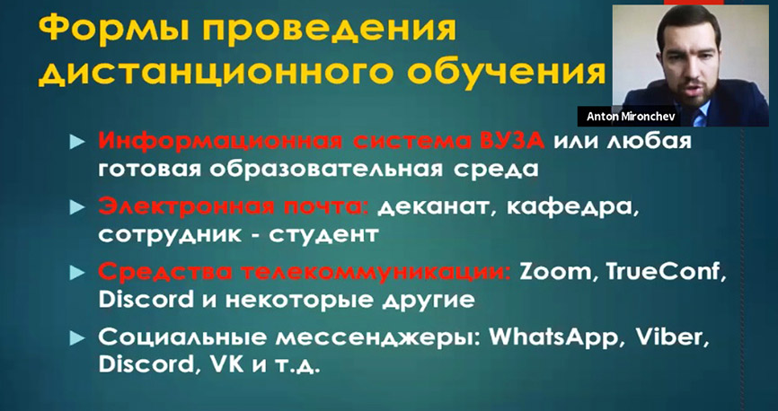 С наибольшей нагрузкой столкнулся лидирующий в регионе по числу иностранных студентов медицинский университет, где из 3 273 таких учащихся 962 человека составляют представители Индии, не смогшие в короткие сроки выехать к себе домой. Но и здесь не возникло серьезных сложностей, в том числе с переводом отбывших и оставшихся на дистанционные формы обучения. Как поведал декан факультета иностранных студентов Оренбургского государственного медицинского университета Антон Мирончев, в вузе уже десять лет успешно используется платформа удаленного обучения собственной разработки, которая позволяет рассылать задания, учебные и методические материалы с мультимедийной составляющей, проводить тестирования. Поэтому от ограниченного применения с началом пандемии вуз комфортно и безболезненно перешел полностью на дистанционные занятия. Эта оренбургская разработка вызвала особый интерес коллег из Казахстана. В практике вуза широко применяются и хорошо зарекомендовавшие себя международные платформы Zoom (для лекций, семинаров, зачетов), TrueConf (для ректоратов и ученых советов), Discord и др.