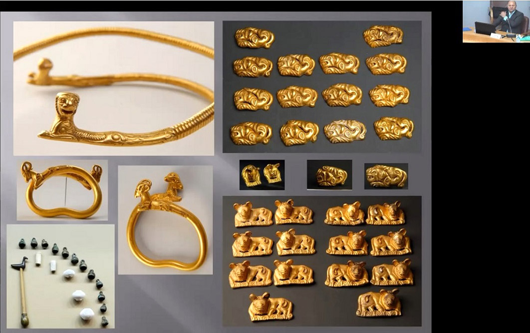 Старший научный сотрудник Оренбургского губернаторского историко-краеведческого музея Вячеслав Трегубов (г. Оренбург, Россия) раскрыл перед юными зрителями сокровища его «Золотой кладовой», где экспонируются высокохудожественные ювелирные изделия V–IV веков до н. э. из сарматских курганов Оренбуржья, составляющие достояние региона и всей мировой культуры. Спустя тысячелетия ценителей поражают тонкостью и изяществом отделки, сочетанием сложных ремесленных приемов не имеющий аналогов парадный меч (акинак) в технике плакировки золотом, серебряная амфора с ручкой в виде бородатого козла, парная чаша с ручками в виде бараньих голов, зеркало с серебряным диском и ажурной золотой ручкой в виде переплетающихся рогов оленя, золотые иглы для нанесения татуировок, шейные гривны, височные подвески с перегородчатой эмалью и другие замечательные предметы. Многие из них украшены в знаменитом «зверином стиле» со сценами охоты хищников, вымершего туранского тигра, мифологических грифонов и т. д. Благодаря плодотворному культурному сотрудничеству России и Казахстана в 2017 г. эти уникальные экспонаты увидели жители Нур-Султана и гости столицы на выездной экспозиции «Золото сарматских вождей», организованной в Национальном музее республики в дни проведения Международной выставки «Астана Экспо».